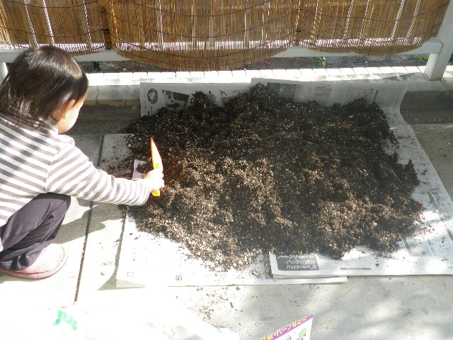そこに新しい土と肥料を混ぜながら水で湿らせて土作り完成!