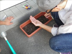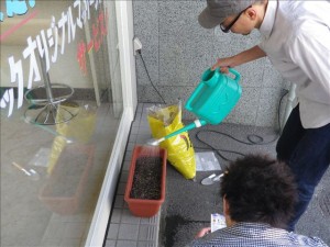 スタッフに付き合ってもらい種まき。(雑用はウノシン、カメラマンに白川氏)