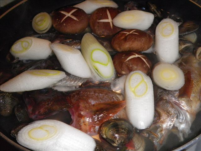 煮汁が出来た鍋(フライパン)にメバル、アサリ、長ネギ、しいたけを適当に投入。