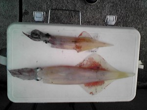 開始早々、山ちゃんの竿にアタリが。 胴長20センチのメスのヤリイカをゲット!