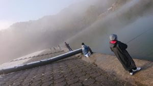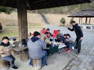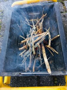 ウノシンが小枝を拾って何とか火をおこす(笑)
