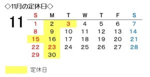 あ、11月の定休日のカレンダーです。コチラ↓↓↓